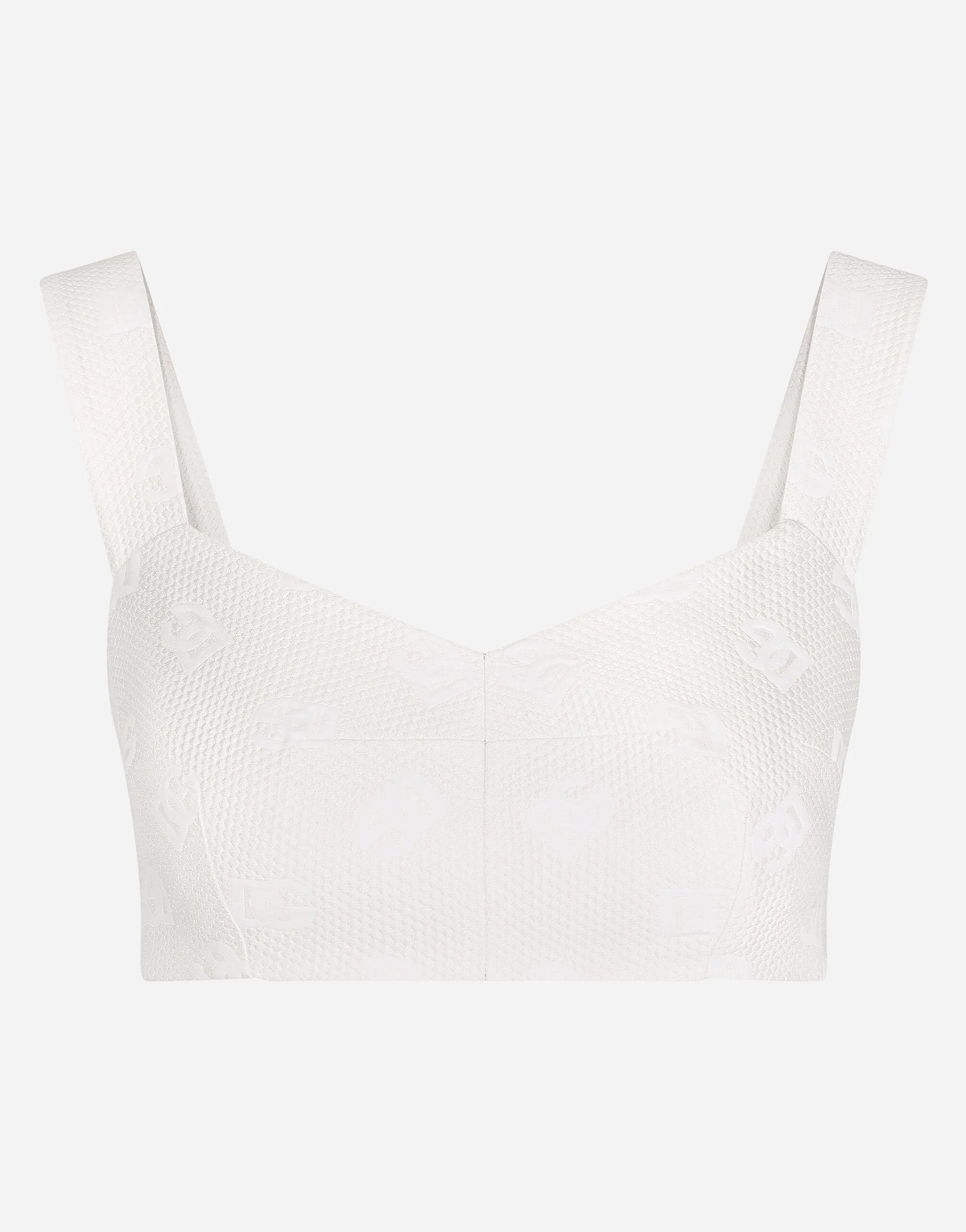 Jacquard corset with all-over DG logo: • Sweetheart neckline • Sleeveless with shoulder straps • Stretch silk crepe de chine lining • Rear zipper and hook-and-eye fastening • The piece measures 9 cm from the center back on a size IT 40 • The model is 175 cm tall and wears a size IT 40 • Made in Italy Care And Details External composition: 63% Cotton 26% Polyester 11% Silk Internal composition: 94% Silk 6% Spandex