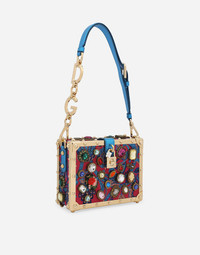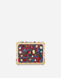 • Padlock fastening in light gold-plated metal with enamel flower embellishment • Detachable strap in foiled Dauphine calfskin • Calfskin lining • Inner pocket with concealed magnetic fastening and a card slot fastening • Item comes with special packaging • Measurements. 14.5 x 19 x 7 cm - 5.7 x 7.5 x 2.8 inches • Made in Italy Care And Details External composition: 50% Polyester 15% Calfskin 14% Silk 14% Metallic Polyester 07% Polyamide