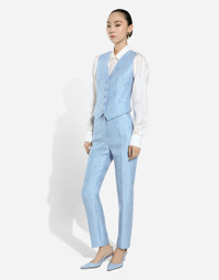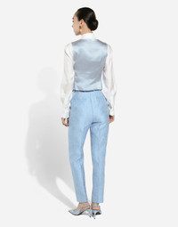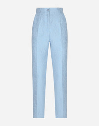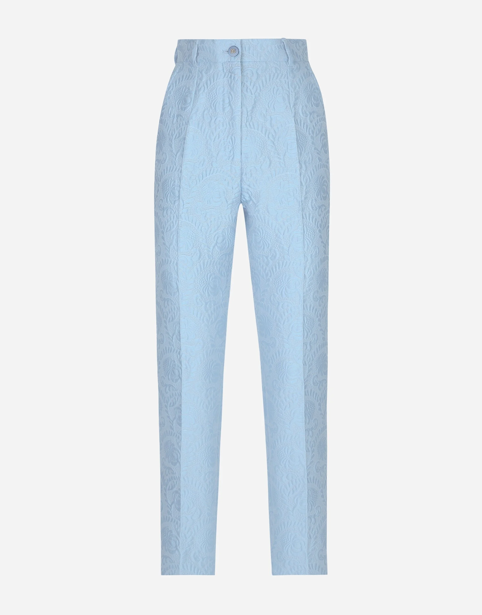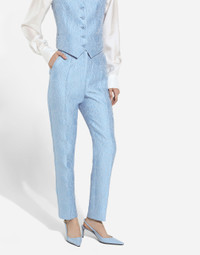 In the FW 24/25 DNA Collection, the rules of classic tailoring have been reworked with an innovative feel. New raschel weave techniques feature on micro-jackets and coats, and original textures are woven on trench coats, skirts, jacquard suits and shirts. The color palette made up of Nero Sicilia black, Milky White and Ocean Blue is also original. The iconic bags in fine nappa leather and “Pyton FC Machine” finish off the looks. Tailored floral quilted jacquard pants: • Light blue • Dolce high waist • Front slant pockets • Welt back pockets • Belt loops • Inner leg: 74 cm • Hem: 17 cm • Zipper and cannete-covered button with DG logo • The model is 175 cm tall and wears a size IT 40 • Made in Italy External composition: 64% Cotton 23% Polyester 13% Silk
