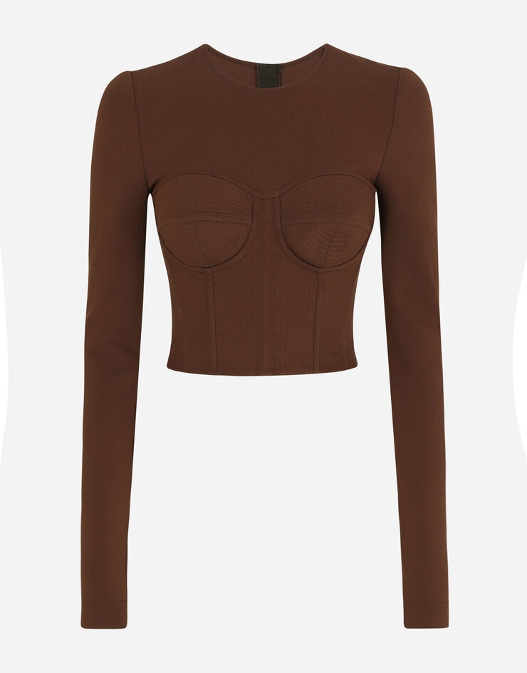 With its Foundation line, Dolce&Gabbana is building a sensual, sophisticated world. Sweaters come to life in combinations of natural, warm and soft hues. Made from stretch jersey with corset details, they emphasize the lines of women's bodies and all their beauty: • Round neck • Long sleeves • Molded cups • Partially lined in stretch silk satin • Rear zipper and hook-and-eye fastening • The piece measures 40.5 cm - 15.9 inches from the center back on a size IT 40 • The model is 175 cm - 68.9 inches tall and wears a size IT 40 • Made in Italy Care And Details External composition: 75% Viscose 17% Polyamide 8% Spandex
