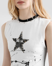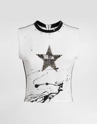 In the Fall/Winter 2025 Fashion Show Collection, shearling jackets, in fur-free versions, reveal slip dresses and create contrast' plays while denim welcomes fabric or Leo print inserts. Sweatshirts are the result of long experimentation with volumes. Evening looks become precious thanks to dresses with special embroideries and luminous touches of sequins and crystals. Sheepskin inserts also unite hats, shoes, and bags, including those with pockets. This jersey tank top with print is perfect for adding a touch of originality to your wardrobe. The multi-colored design and unique details such as the divisible zip in the center back and the contrasting collar make this garment ideal for those looking for a distinctive style. Jersey sleeveless t-shirt with print: • Multi-colored • With divisible zip in the center back • Raw cut at the bottom and at the armhole • Garment with spoils • The model is 175 cm tall and wears size 40 IT • Made in Italy External Composition: 100% Cotton
