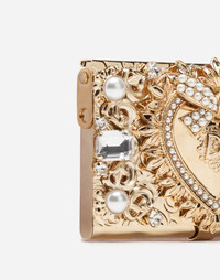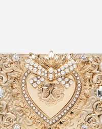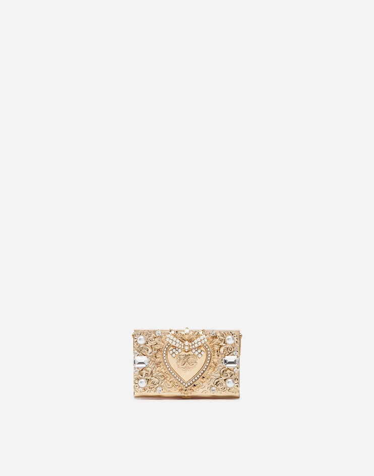 Hot off the runway; the Fashion Devotion collection. Jewel micro-bag in repoussé metal set with crystals and pearls with bejeweled heart edged in micro pearls and hand applied filigree: • Suede lining • Detachable chain in light galvanized gold • Dimensions: 9.5 x 6 x 1.4 cm – 3.7 x 2.4 x 0.6 inches • Made in Italy Care And Details External composition: 70% Brass 30% Crystal Internal composition: 100% Sheep Leather