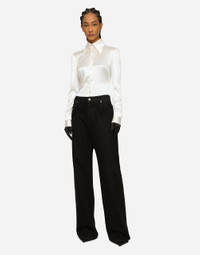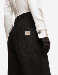 Flared deep blue denim jeans: • High-waisted • 5 pockets • Branded “Kim Dolce&Gabbana” label on the coin pocket • Branded metal and leather “Kim Dolce&Gabbana” tag on the back pocket • Inner leg: 83.3 cm • Hem: 23.5 cm • “Kim Dolce&Gabbana” inner label • Metal button with logo and zipper • The model is 175 cm tall and wears a size IT 40 • Made in Italy Care And Details External composition: 100% Cotton