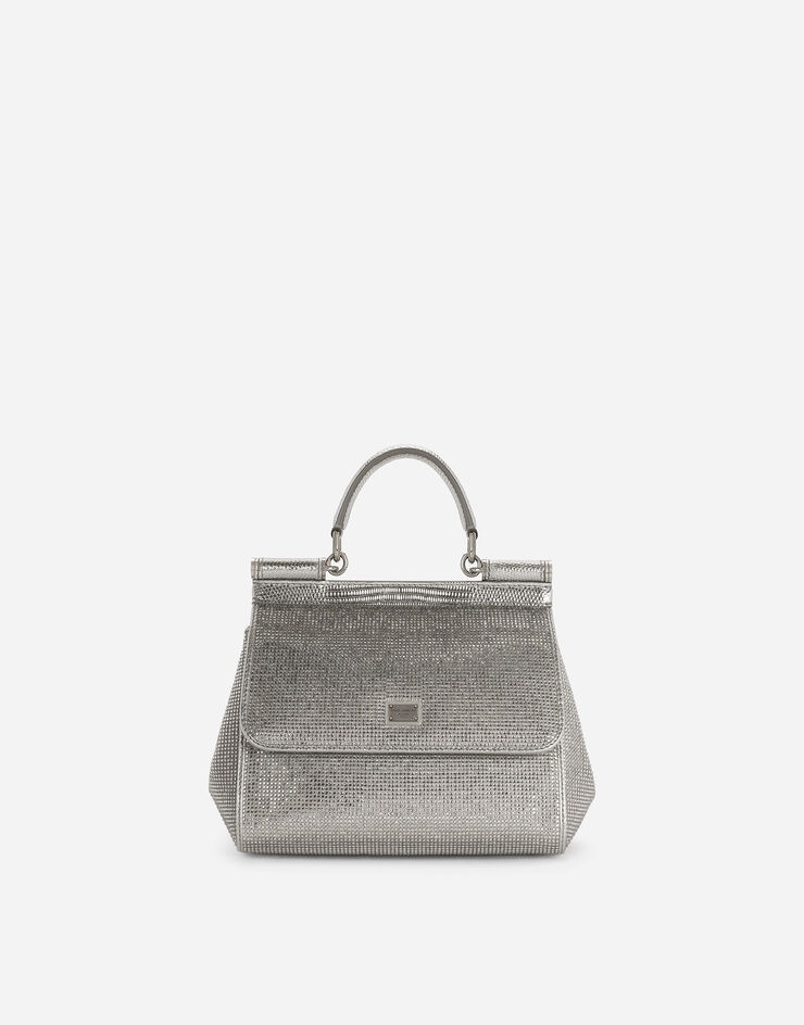 Small Sicily bag in satin with all-over rhinestones and the palladium-plated metal logo tag: • Front flap with hidden double magnetic fastening • Branded tag • Top handle and adjustable, detachable strap in foiled iguana-print calfskin • Satin lining • Inner pocket with branded zipper , card compartment and a cell phone holder • Item comes with a branded dust bag • Measurements: 16 x 20 x 8 cm • Made in Italy Care And Details External composition: 55% Viscose 25% Silk 20% Calfskin Internal composition: 50% Viscose 25% Silk 10% Calfskin 10% Polyamide 5% Polyurethane