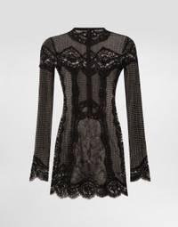 In the Fall/Winter 2025 Fashion Show Collection, shearling jackets, in fur-free versions, reveal slip dresses and create contrast' plays while denim welcomes fabric or Leo print inserts. Sweatshirts are the result of long experimentation with volumes. Evening looks become precious thanks to dresses with special embroideries and luminous touches of sequins and crystals. Sheepskin inserts also unite hats, shoes, and bags, including those with pockets. This knitted dress with lace details combines elegance and comfort, perfect for any occasion that requires a touch of sophistication. Knitted dress with lace: • Black • Long sleeves • The model is 175 cm tall and wears size 40 IT • Made in Italy External Composition: 70% Viscose, 20% Cotton, 10% Polyamide