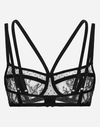 The balconette bra is getting a makeover and comes imbued with new; modern femininity. Made from black floral Chantilly lace and plumetis; it will give your looks that seductive edge with its light; sophisticated charm. • Sweetheart neckline • Unlined • Thin adjustable straps • Adjustable; 3-position hook-and-eye fastenings on the back • The model is 175 cm tall and wears a size IT 40 • Made in Italy External composition: 70% Polyamide 30% Viscose