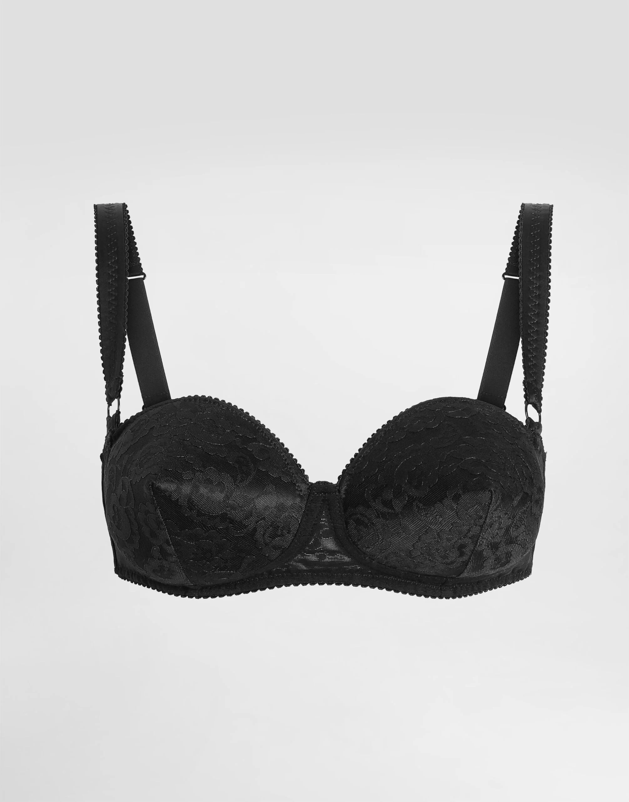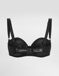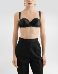 The Spring/Summer 2025 Women’s Collection is celebrating Italian beauty through bold and charismatic femininity. The 50s-inspired lingerie is the star, intermingling with fitted dresses, corsets and oversize trench coats. The iconic jackets have been updated with cropped cuts and modern inserts, while the floral prints add a romantic edge. The eveningwear shines with light fabrics and crystals, accompanied by look-defining accessories, from iconic bags to the cross earrings. Lace balconette bra with conical cups: • Black • Fully padded conical cups • Stretch straps with branded adjustable details • Adjustable, 2-position hook-and-eye fastenings on the back • Made in Italy External composition: 65% Polyamide 25% Silk 10% Spandex Internal composition: 94% Silk 06% Spandex