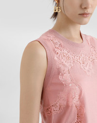 The Women’s DNA Collection is introducing a new side to femininity, which comes in shades of rose quartz, poised between sheerness and opacity, lightness and structure, formality and sensuality. Geometric Dolce Jackets, jacquard pajamas and floral brocade dresses intertwine with ultra-romantic designs. The DG print becomes an iconic statement, while Cordonetto lace and hints of Sicily Black embody the essence of a determined yet romantic femininity. Wool tank top with lace inlay: • Pink • 18-gauge knit • Round neck • Sleeveless • Ribbed neck and hem • Regular fit • The piece measures 60 cm from the shoulder seam on a size IT 40 • The model is 175 cm tall and wears a size IT 40 • Made in Italy External composition: 60% Virgin Wool 32% Cotton 8% Polyamide