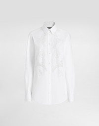 The Women’s DNA Collection is introducing a new side to femininity, which comes in shades of rose quartz, poised between sheerness and opacity, lightness and structure, formality and sensuality. Geometric Dolce Jackets, jacquard pajamas and floral brocade dresses intertwine with ultra-romantic designs. The DG print becomes an iconic statement, while Cordonetto lace and hints of Sicily Black embody the essence of a determined yet romantic femininity. Cotton poplin shirt with lace inlay: • White • Shirt collar • Long sleeves • Regular fit • Button fastenings with branded bottom edge • The piece measures 75 cm from the center back on a size IT 40 • The model is 175 cm tall and wears a size IT 40 • Made in Italy External composition: 92% Cotton 06% Polyamide 02% Spandex