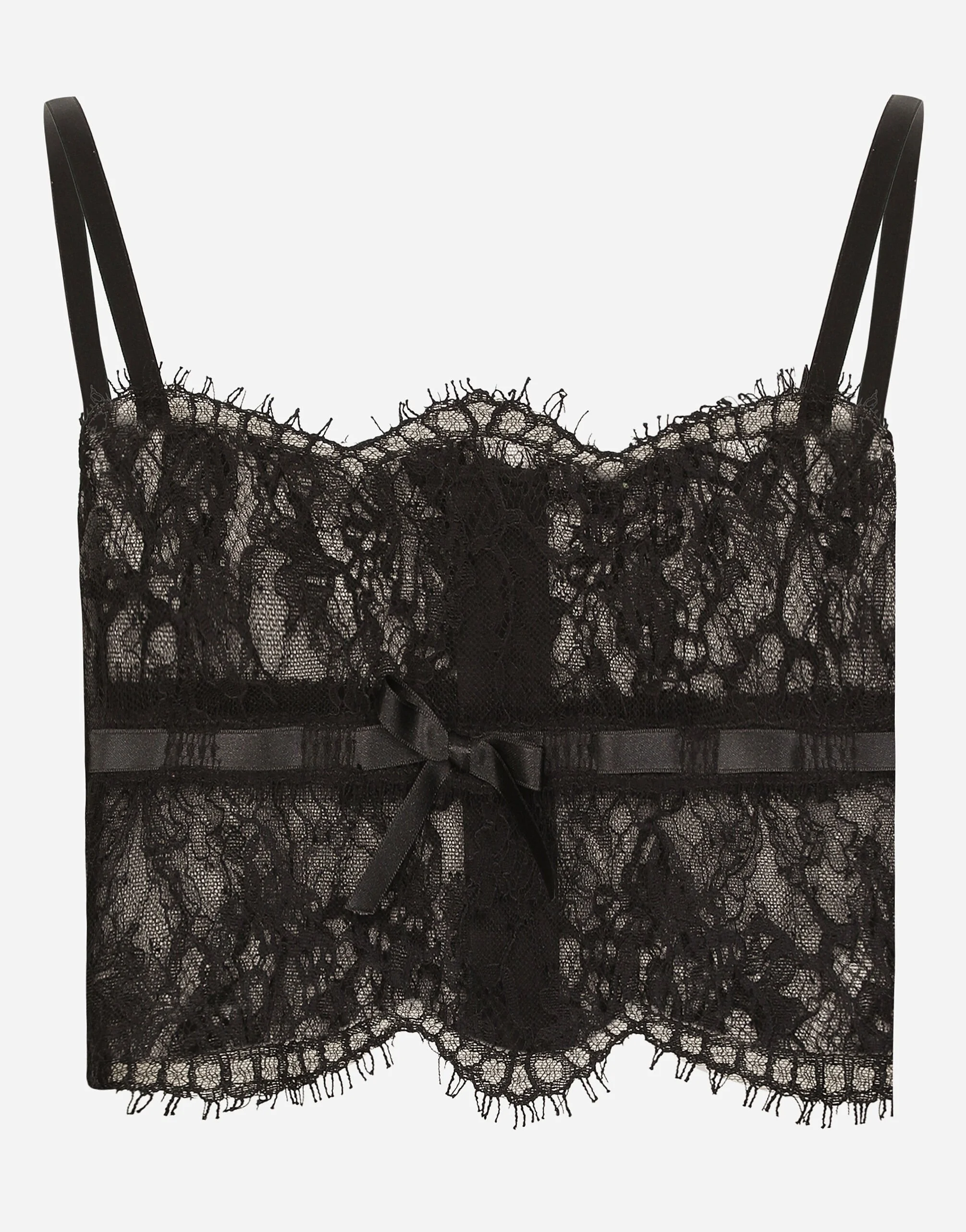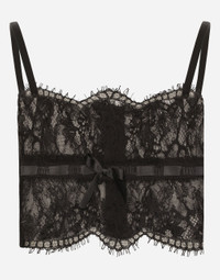 Menswear and womenswear mix and mingle, influencing one another and creating tailoring that embraces endless nuances, from the boldest to the most sophisticated, to define the rules of eternally classy femininity. A monochrome retelling in Nero Sicilia black, embellished by golden touches and rhinestones, adorning clean lines and incorporating stylish fabrics such as velvet, chiffon, lace, organza, and unique mesh details, the expression of authentic beauty for dresses, shirts and accessories. Lace lingerie top: • Straight neckline • Shoulder straps • Unlined • Hook-and-bar fastenings on the back • The model is 175 cm tall and wears a size IT 40 • Made in Italy External composition: 65% Cotton 30% Polyamide 5% Polyester Internal composition: 100% Polyamide