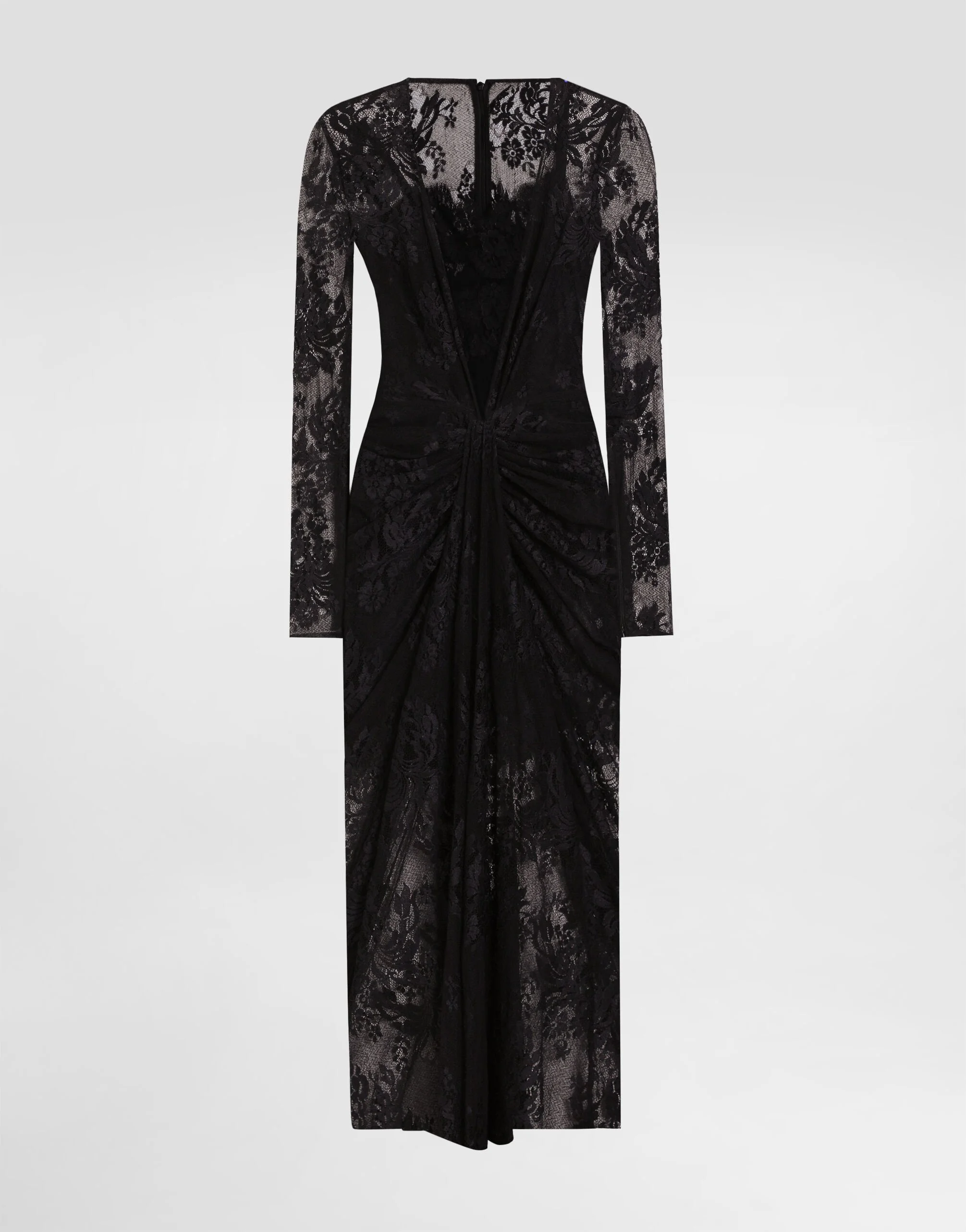This floral lace dress is perfect for elegant evenings and special occasions. With a plunging neckline and refined details, it embodies femininity and timeless elegance. Floral lace dress: • Black • Deep V neckline • Encrusted on neckline, vita e hem • Fitted long sleeves • Soft drapes and pleats • Concealed zipper with buttonhole and hook closure • Tulle piping on the sides • Inserted slip • The model is 175 cm tall and wears size 40 IT • Made in Italy External Composition: 92% Polyamide, 8% Elastane Internal Composition: 66% Polyamide, 22% Cotton, 12% Elastane