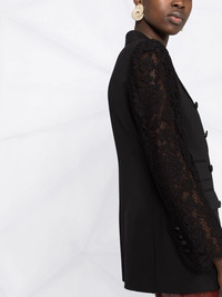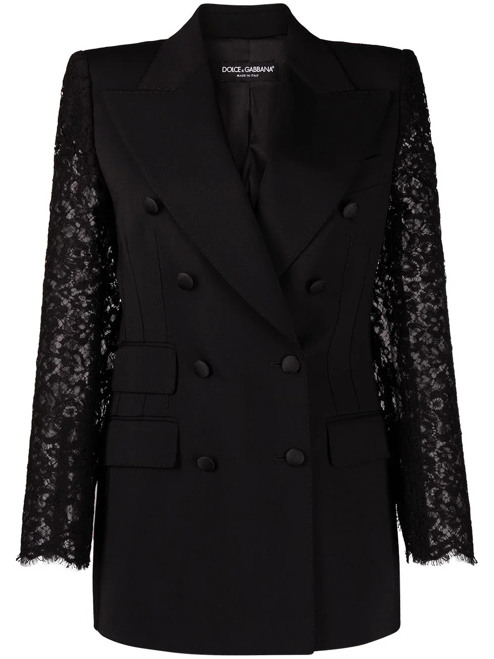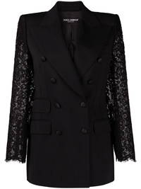 lace-sleeve blazer Embrace the darkly romantic aesthetic of this blazer. Imagined with lace sleeves, this double-breasted blazer from Dolce & Gabbana makes a demure choice. Interlace it into your wardrobe. Made in Italy Composition Lining: Silk 64%, Polyamide 30%, Spandex/Elastane 6% Outer: Virgin Wool 67%, Cotton 15%, Viscose 12%, Polyamide 3%, Spandex/Elastane 3% SIZE & FIT Model measurements Height 5 ft 11 in(1.8 m) Bust/Chest 32.67 in(83 cm) Hips 36.22 in(92 cm) Waist 24.4 in(62 cm) Measurement SLEEVE LENGTH 16.14 in(41 cm) Shoulder Width 15.74 in(40 cm) LENGTH 28.34 in(72 cm) WAIST 36.22 in(92 cm) BUST 38.58 in(98 cm) FittingInformation This piece fits true to size. We recommend you get your regular size Cut for a slim fit Made with a mid-weight fabric Washing instructions Dry Clean Only