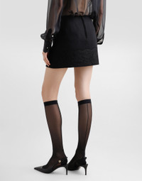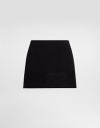 The Women's Black Sicily Collection reinforces Dolce&Gabbana's iconic fabrics and codes rooted in Italian heritage. Sensual silhouettes, highlighted by floral prints and refined corsetry, evoke an intriguing elegance, while the iconic black lace, satin, and velvet dominate the collection. Denim in various shades of blue introduces a contemporary twist, balancing the classic and modern. Embroidered crosses, medals, and jewelry add a sophisticated touch. Wool crepe miniskirt with lace trim: • Black • Low rise • Stretch silk satin lining • Rear zipper and hook-and-bar fastening • The piece measures 38 cm from the waist down on a size IT 40 • The model is 175 cm tall and wears a size IT 40 • Made in Italy External composition: 07% Cotton 03% Polyamide 10% Viscose 80% Wool Internal composition: 92% Silk 08% Spandex