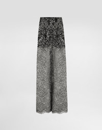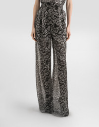 Elegance, tailored lines and sparkling details define the Dolce&Gabbana Holiday collection. Sixties inspirations blend with a contemporary aesthetic. For him, structured jackets and cuts that enhance the silhouette for her, silver brocade and crystals illuminate festive looks. Each piece stands out for its fine materials, attention to detail and distinctive style. These loose-fitting lame lace trousers are the epitome of sophisticated, modern elegance. Perfect for those who want a distinctive look, they adapt to different occasions with a refined touch. Lame lace trousers: • Silver • Wide trousers with two pleats on waist • 4 cm high belt with internal elastic • French pockets • Inner slip shorts in silver lining • Hem width is 35 cm on size 40 IT • Made in Italy External composition: 35% Metallic Polyester, 23% Polyamide, 21% Cotton, 21% Viscose Internal composition: 100% Polyester