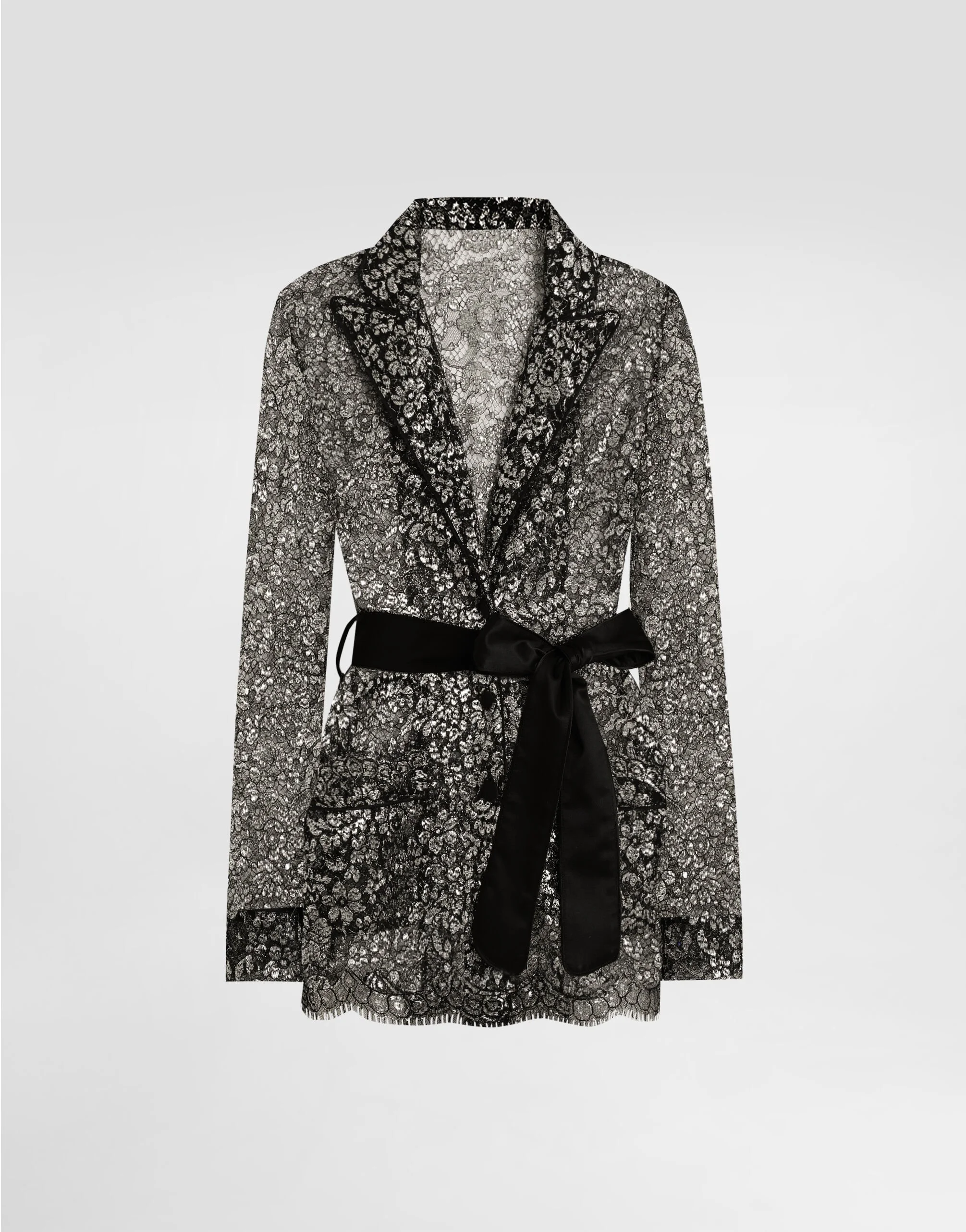 Elegance, tailored lines and sparkling details define the Dolce&Gabbana Holiday collection. Sixties inspirations blend with a contemporary aesthetic. For him, structured jackets and cuts that enhance the silhouette for her, silver brocade and crystals illuminate festive looks. Each piece stands out for its fine materials, attention to detail and distinctive style. This lame lace vanity shirt is a stylish and sophisticated piece that is perfect for adding a precious touch to your wardrobe. With refined details such as the lapel collar and the knotted belt at the waist, it is ideal for those looking for a distinctive and refined style. Lame lace vanity shirt: • Silver • Lapel collar with spear tip • Patch pockets on the front • Self-tie belt at waist • Long sleeves with cuff edge • Length from shoulder is 75 cm on size 40 IT • Made in Italy External composition: 28% Metallic Polyester, 20% Silk, 18% Polyamide, 17% Cotton, 17% Viscose