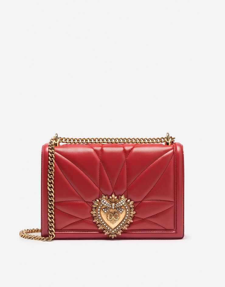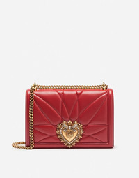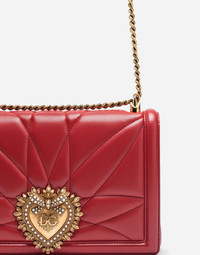Straight off the runway, the Devotion Bag is the new object of desire. Born from the love of craftsmanship and attention to detail, the bag is embellished with the ultimate symbol of love: the sacred heart. Large shoulder bag from the Devotion Line in quilted nappa leather: • Adjustable nappa leather chain strap, inspired by the work of high-quality jewellers • Front flap with hand-made jewelled heart in metal alloy with an inlay of pearls • Hidden snap button fastening • Interior pocket featuring a zip slider branded Devotion • Nappa leather interior embellished with a heart • Item comes with branded Dust Bag • Measurements: 25.5 x 17.5 x 5.5 cm - 10 x 6.9 x 2.2 inches • Made in Italy Care And Details External Composition : 100% Lambskin Internal Composition: 100% Lambskin