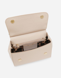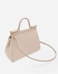 The brand icon par excellence; this large Sicily bag comes in Dauphine calfskin. Understated and feminine; it comes with the logo tag featuring two metal plating finishes. Large handbag from the Sicily line in Dauphine leather. • Front flap with hidden snap closure and galvanic logo plate in the front • Top handle and adjustable and removable leather shoulder strap • Cotton interior with Leo print • Internal zip pocket and smartphone pocket • Metal studs on the bottom • Comes with logoed Dust Bag • Measurements. 026 x 21 x 12 cm • Made in Italy External composition: 100% Calfskin Internal composition: 80% Cotton 20% Calfskin