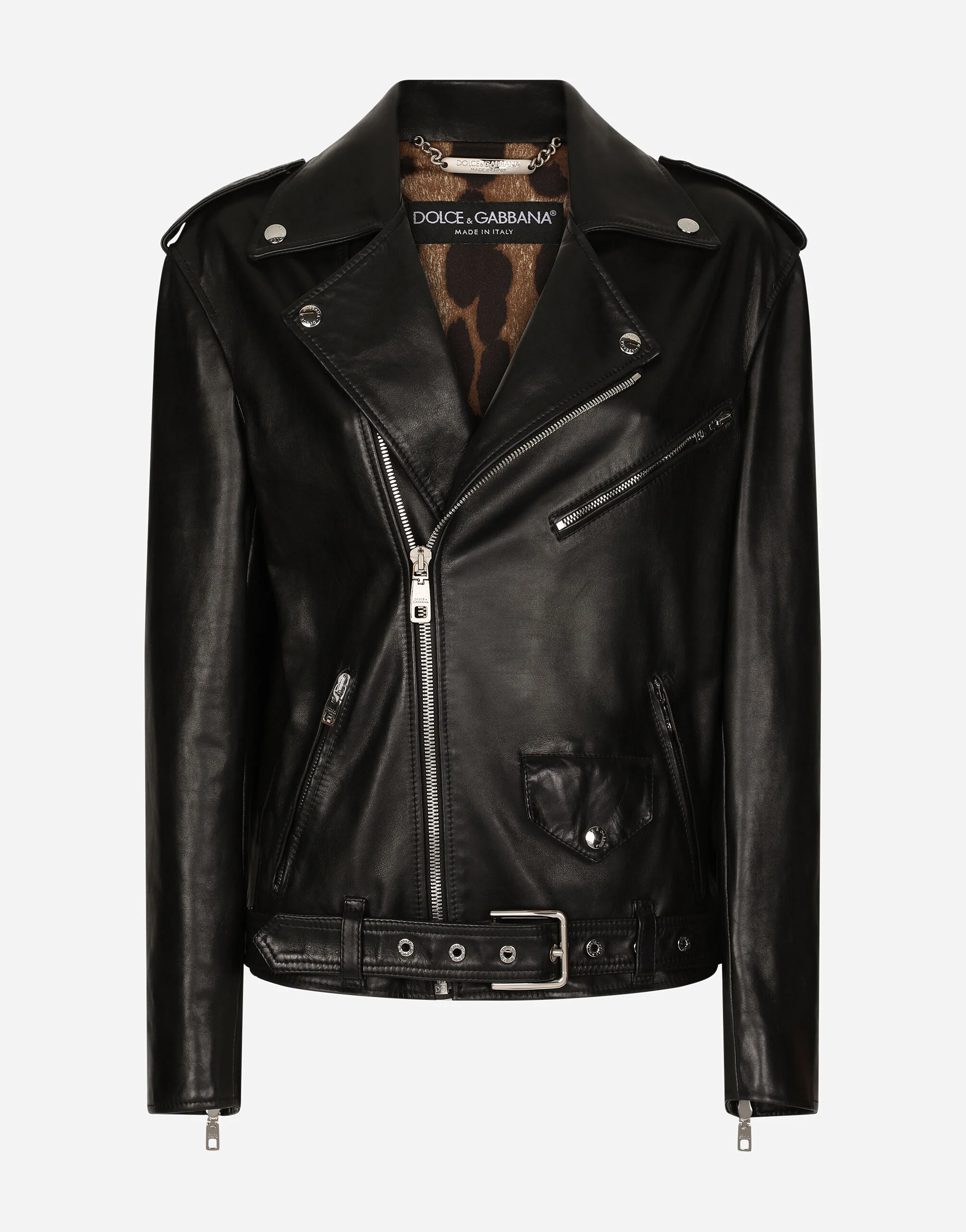 Leather biker jacket: • Shirt collar • Long sleeves with silver-plated zipper • Pockets with silver-plated zipper • Leopard-print stretch satin lining • Silver-plated zipper on the side • The piece measures 60.5 cm from the rear collar seam on a size IT 40 • The model is 175 cm tall and wears a size IT 40 • Made in Italy Care And Details External composition: 100% Calfskin Internal composition: 97% Polyester 3% Spandex
