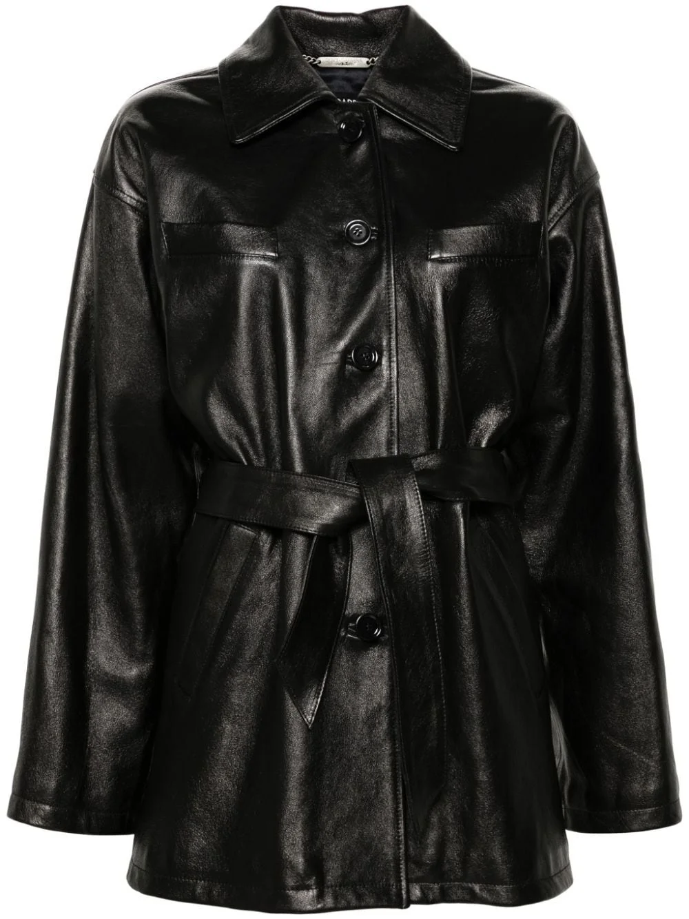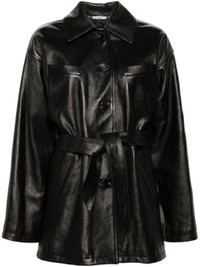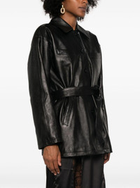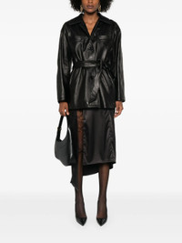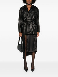 black lambskin smooth grain front button fastening spread collar drop shoulder long sleeves belt loops detachable waist belt three front welt pockets quilted lining straight hem Size & Fit Model Measurements: Height: 1.8 m Bust/Chest: 82.0 cm Hips: 93.0 cm Waist: 63.0 cm Model wears size 40 Fabric and Care Designer Style ID: F0E2RLHULUF Designer Colour: N0000 BLACK Composition: Outer: Lamb skin 100%; Lining: Polyester 100% Washing instructions: Specialist Cleaning Made in Italy