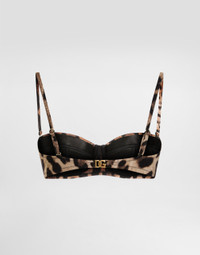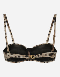 The iconic leopard print adorns this balconette bikini top that comes in fine spandex. It is perfect for enhancing the femininity and sensuality of every woman. • Bikini top with padded cups and underwiring • Adjustable and detachable straps • Rear branded fastening in nickel-free gold-plated metal • Matching PVC pouch • Made in Italy External composition: 75% Polyamide 25% Spandex