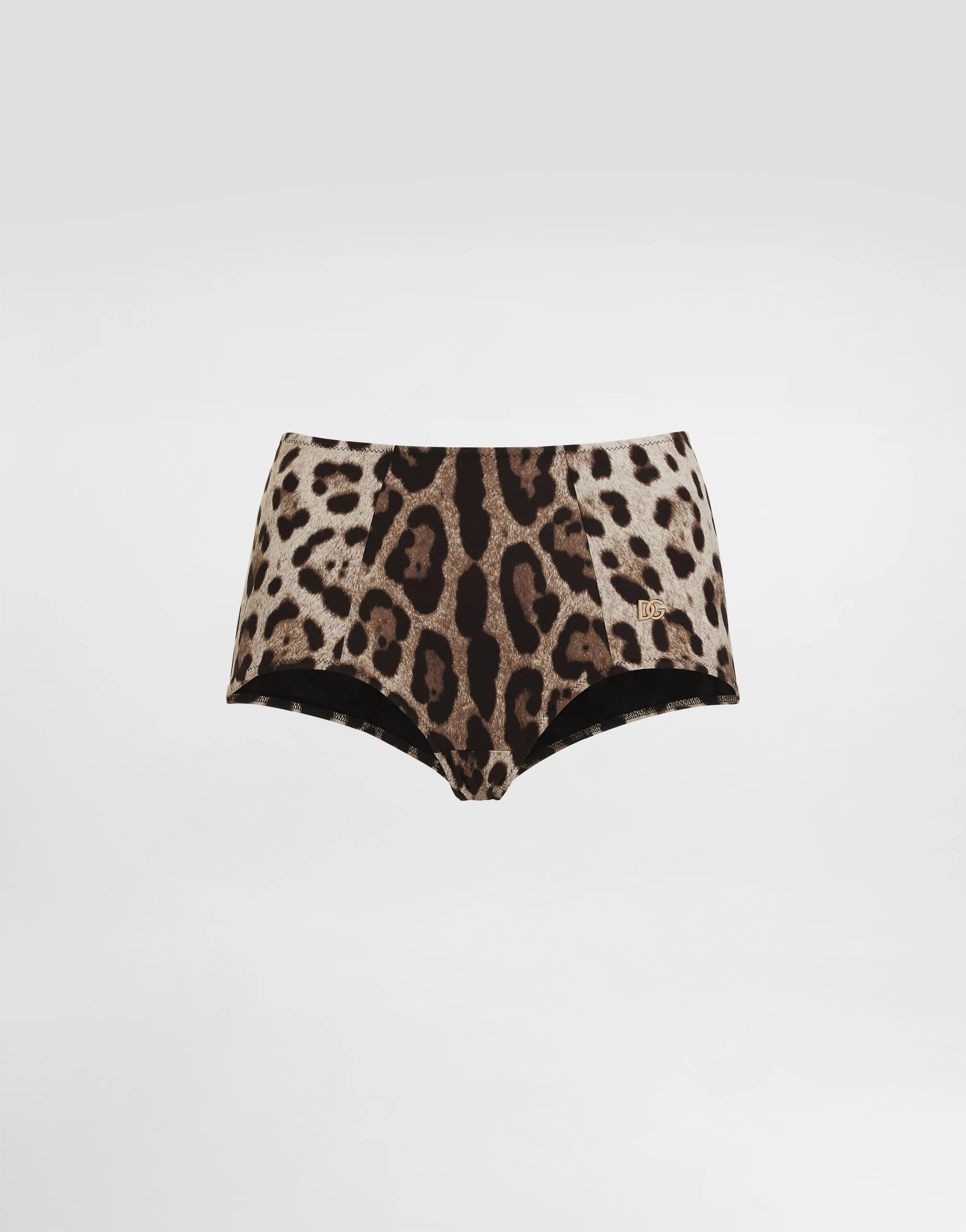 These iconic 50s-style high-waisted bikini bottoms from Dolce&Gabbana; that today are oh-so current; come in fine spandex with the iconic leopard print to offer you bold; sensual allure. • High-waisted • DG logo in nickel-free gold-plated metal on the front side • Matching PVC pouch • Made in Italy External composition: 75% Polyamide 25% Spandex