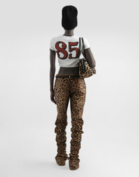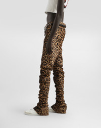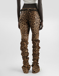 In the Fall/Winter 2025 Fashion Show Collection, shearling jackets, in fur-free versions, reveal slip dresses and create contrast' plays while denim welcomes fabric or Leo print inserts. Sweatshirts are the result of long experimentation with volumes. Evening looks become precious thanks to dresses with special embroideries and luminous touches of sequins and crystals. Sheepskin inserts also unite hats, shoes, and bags, including those with pockets. These Calf trousers are an iconic piece that combines boldness and style, perfect for those who want a distinctive and trendy look. Leopard-print calf trousers: • Multi-colored • The model is 175 cm tall and wears size 40 IT • Made in Italy External Composition: 100% Calf Internal Composition: 83% Silk, 10% Lamb, 7% Elastane