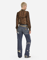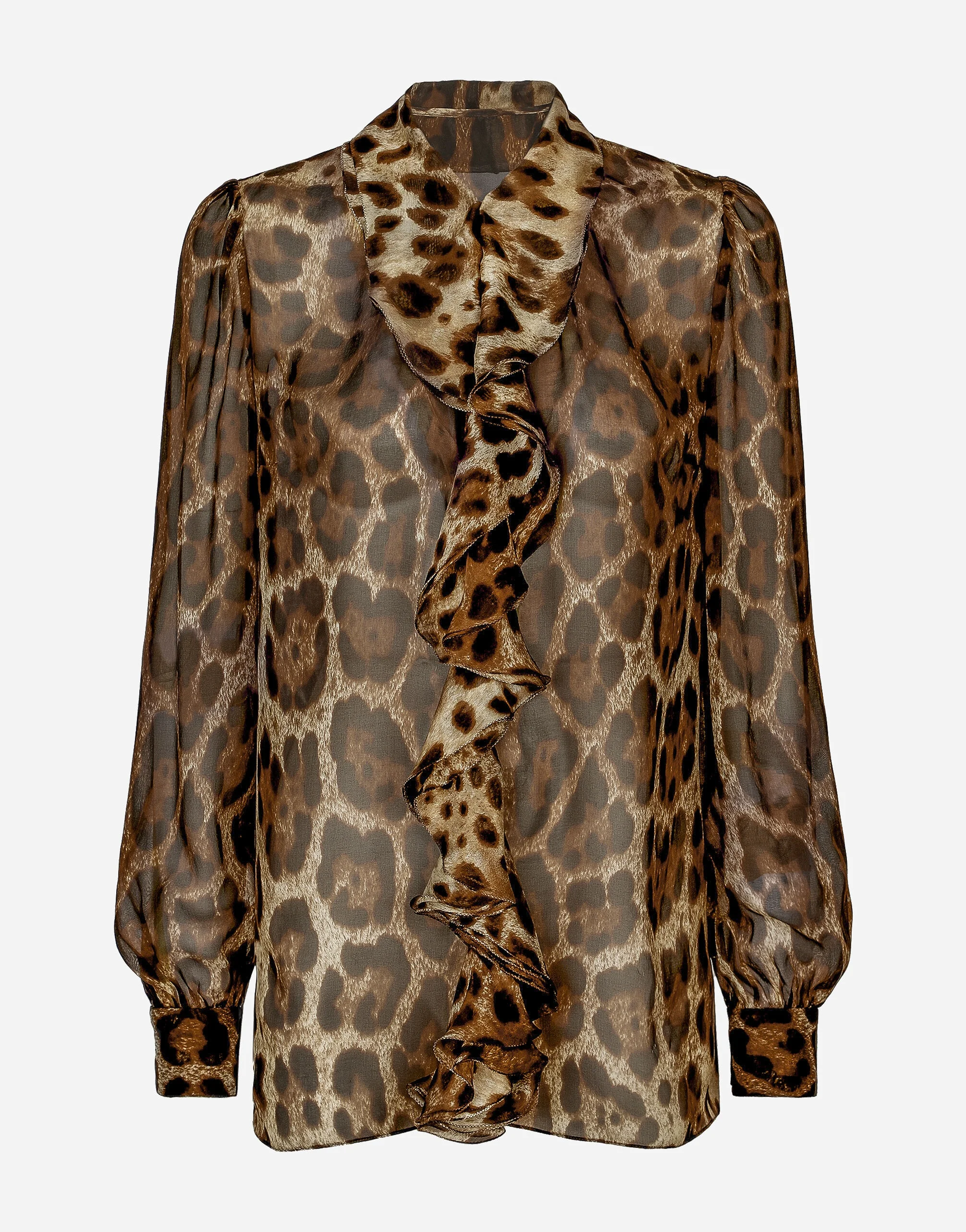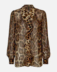 Leopard-print chiffon shirt with ruches: • Animal print • Round neck • Long sleeves with buttoned cuffs • Regular fit • Unlined • Small press-stud fastenings on the front • The piece measures 70 cm from the center back on a size IT 40 • The model is 175 cm tall and wears a size IT 40 • Made in Italy The difference in the print placement that you may find on this product is a feature of Dolce&Gabbana’s “Handmade” pieces. A detail that makes every garment or accessory unique and exclusive. Care And Details External composition: 100% Silk