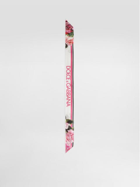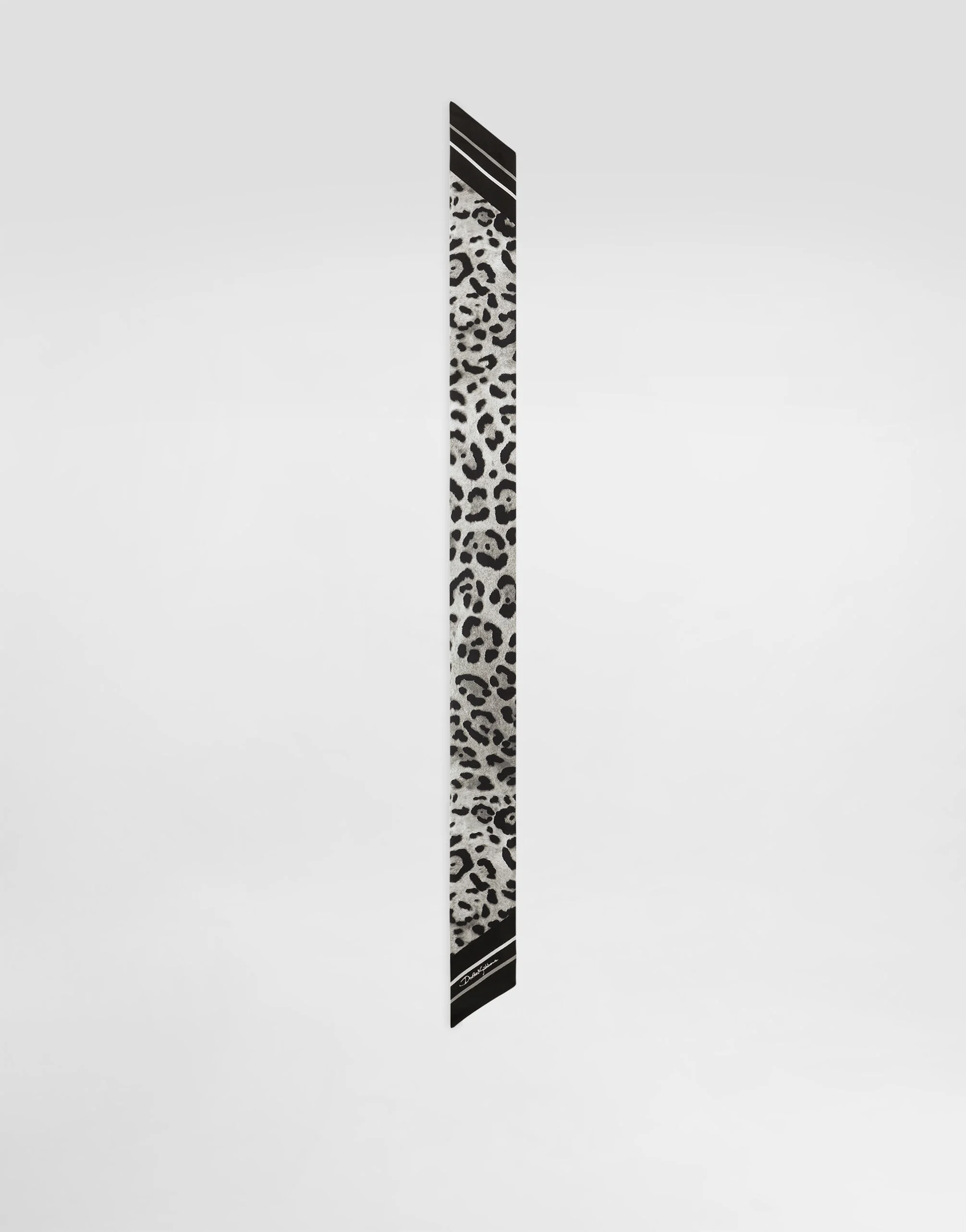 The Everyday Women's Collection reimagines contemporary daily wear with Dolce&Gabbana's signature style codes. Iconic fabrics mix with standout details like embroidered flowers, crystals, and jewel buttons, infusing elegance into every look. Gray animal print accented with green and purple, hyper-geometric jewelry, voluminous shapes and transparencies add unique touches. Men's tweed is reinvented with graphic twists, creating distinctive pieces that reflect refined sensuality. Silk twill headscarf with leopard print: • Leopard print • “Dolce&Gabbana” logo • Measurements: 6 x 100 cm • Made in Italy The difference in the print placement that you may find on this product is a feature of Dolce&Gabbana’s “Handmade” pieces. A detail that makes every garment or accessory unique and exclusive. External composition: 100% Silk