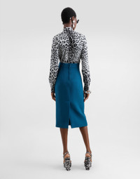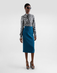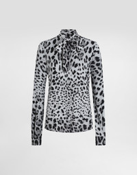 The Everyday Women's Collection reimagines contemporary daily wear with Dolce&Gabbana's signature style codes. Iconic fabrics mix with standout details like embroidered flowers, crystals, and jewel buttons, infusing elegance into every look. Gray animal print accented with green and purple, hyper-geometric jewelry, voluminous shapes and transparencies add unique touches. Men's tweed is reinvented with graphic twists, creating distinctive pieces that reflect refined sensuality. Stretch silk charmeuse shirt with pussy-bow and leopard print: • Animal print • Crew-neck with pussy-bow • Long sleeves • Regular fit • Covered placket with button fastening • The piece measures 65 cm from the back of the neck on a size IT 40 • The model is 175 cm tall and wears a size IT 40 • Made in Italy The difference in the print placement that you may find on this product is a feature of Dolce&Gabbana’s “Handmade” pieces. A detail that makes every garment or accessory unique and exclusive. External composition: 95% Silk 05% Spandex