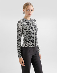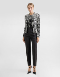 The Everyday Women's Collection reimagines contemporary daily wear with Dolce&Gabbana's signature style codes. Iconic fabrics mix with standout details like embroidered flowers, crystals, and jewel buttons, infusing elegance into every look. Gray animal print accented with green and purple, hyper-geometric jewelry, voluminous shapes and transparencies add unique touches. Men's tweed is reinvented with graphic twists, creating distinctive pieces that reflect refined sensuality. Leopard-print silk cardigan: • Animal Print • 18-gauge knit • Round neck • Long sleeves • French seam armholes • Dense hand • Ribbed neck and hem • Regular fit • Button fastenings • The piece measures 57 cm from the shoulder seam on a size IT 40 • The model is 175 cm tall and wears a size IT 40 • Made in Italy External composition: 100% Silk