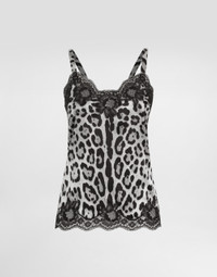 The Everyday Women's Collection reimagines contemporary daily wear with Dolce&Gabbana's signature style codes. Iconic fabrics mix with standout details like embroidered flowers, crystals, and jewel buttons, infusing elegance into every look. Gray animal print accented with green and purple, hyper-geometric jewelry, voluminous shapes and transparencies add unique touches. Men's tweed is reinvented with graphic twists, creating distinctive pieces that reflect refined sensuality. Stretch silk satin lingerie-style top with leopard print and lace detailing: • Leopard print • Sweetheart neckline • Adjustable straps • Unlined • The piece measures 60 cm from the strap on an IT size 2 • Made in Italy The difference in the print placement that you may find on this product is a feature of Dolce&Gabbana’s “Handmade” pieces. A detail that makes every garment or accessory unique and exclusive. External composition: 84% Silk 8% Cotton 6% Spandex 2% Polyamide
