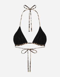The iconic leopard print features on this classic triangle bikini top in fine spandex fabric and thanks to the adjustable ties it offers a great; comfort fit. • Adjustable ties on the neck and back • Branded DG aglets in nickel-free gold-plated metal • Soft cup with removable padding • Matching PVC pouch • Made in Italy External composition: 75% Polyamide 25% Spandex
