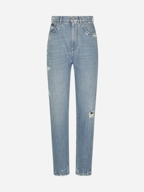 Dolce&Gabbana is conveying a new way of interpreting denim and does so by drawing inspiration from key words such as glamor and signature aesthetic, creating a collection that is perfect for every style and personality, merging femininity, modernity and originality. Stonewash cotton denim Amber jeans with rips: • Blue • High-waisted • 5 pockets • Branded label on the coin pocket • Branded metal and leather tag on the back pocket • Leg length from waistband: 107 cm • Hem: 15 cm • Zipper and branded metal button fastening • The model is 175 cm tall and wears a size IT 40 • Made in Italy External composition: 100% Cotton