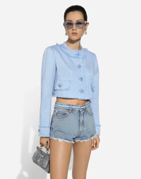 Dolce&Gabbana is conveying a new way of interpreting denim and does so by drawing inspiration from key words such as glamor and signature aesthetic, creating a collection that is perfect for every style and personality, merging femininity, modernity and originality. Light stonewash cotton denim shorts: • Blue • High-waisted • 5 pockets • Branded leather stick label on the back pocket • Tobacco brown top-stitching • Leg length: 28.4 cm • Inner leg: 3.5 cm • Zipper and branded metal button fastening • The model is 175 cm tall and wears a size IT 40 • Made in Italy External composition: 100% Cotton