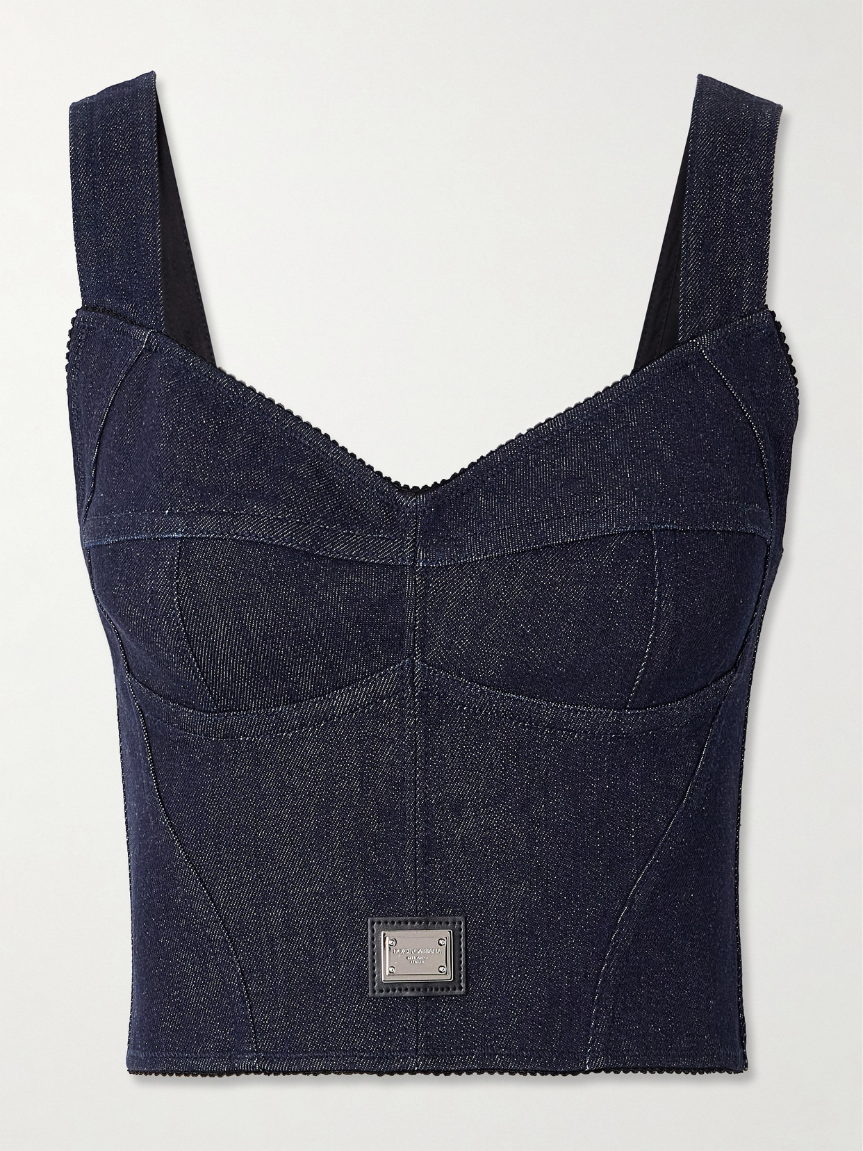 Dolce & Gabbana's denim bustier top is the perfect match to the label's floaty, high-rise skirts and tailored pants. It has dainty picot trims framing the sweetheart neckline and stretchy panels along the back to ensure a close yet comfortable fit.