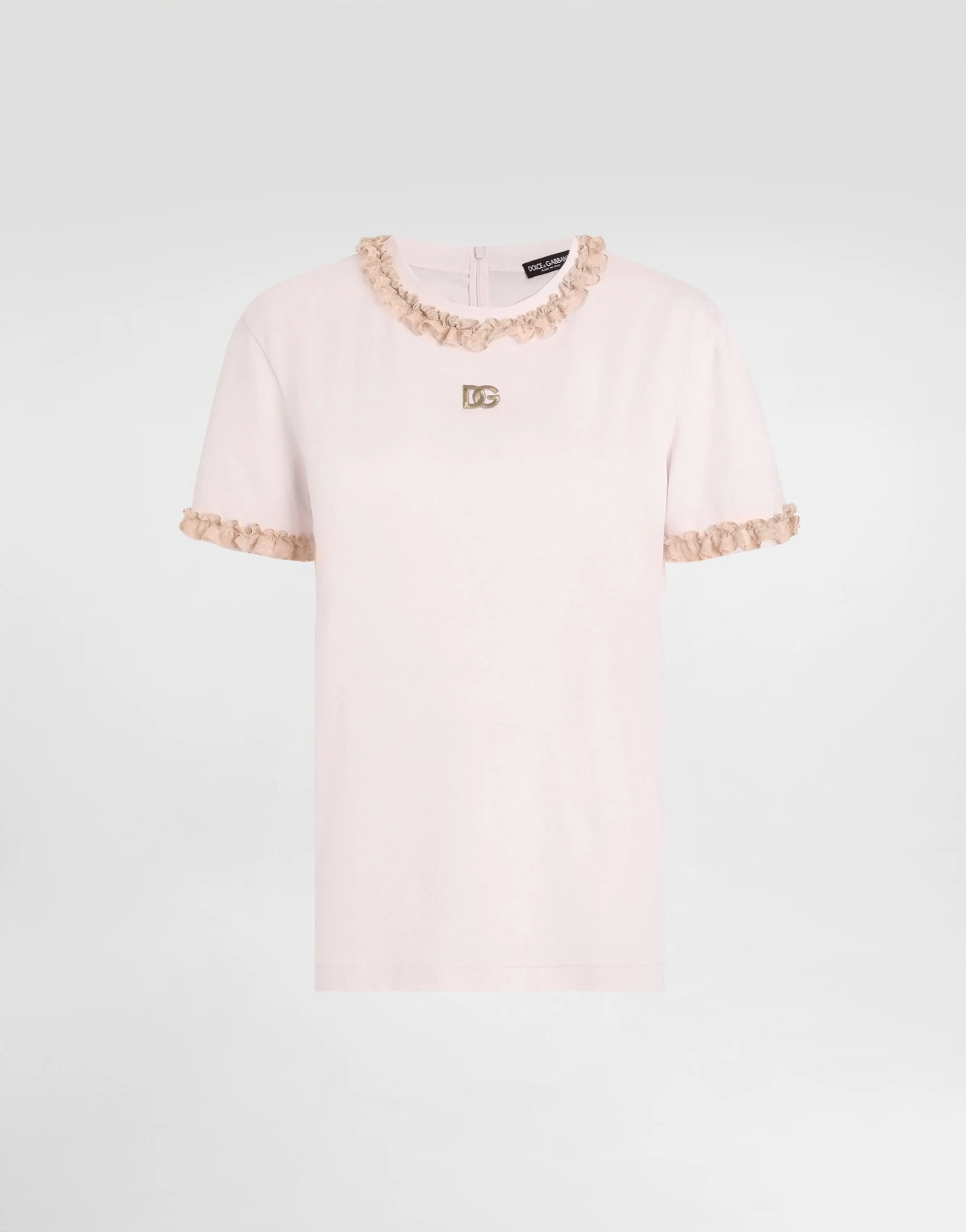 This Jersey t-shirt for women is a versatile and refined garment, perfect for adding a touch of elegance to your everyday wardrobe. The embroidery on the front and the gathered lace in the neckline and at the bottom of the sleeves make it unique and feminine. Jersey t-shirt with lace and embroidery: • Pink • Gathered lace at the neckline at the bottom of the sleeves • Short sleeves • The model is 175 cm tall and wears size 40 IT • Made in Italy External Composition: 99% Cotton, 1% Polyamide