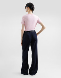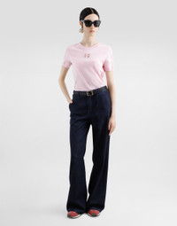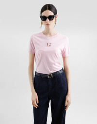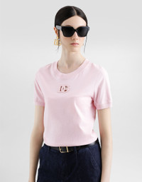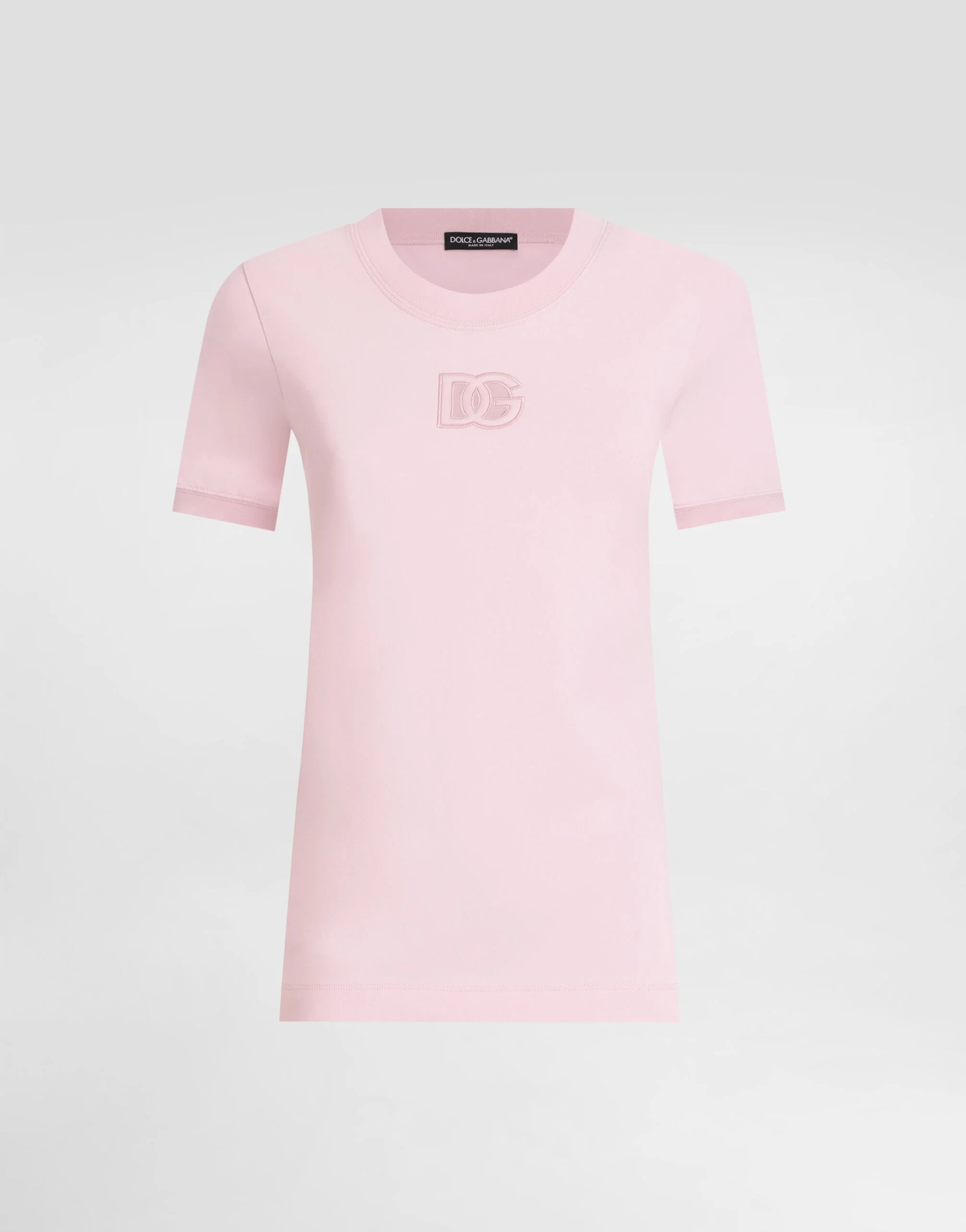 Cotton jersey T-shirt with raised DG logo embroidery: • Pink • Round neckline • Short sleeves • Folded ribbed neck and sleeve trims • Form fitting • The piece measures 60.5 cm from the back of the neck on a size IT 40 • The model is 175 cm tall and wears a size IT 40 • Made in Italy External composition: 100% Cotton