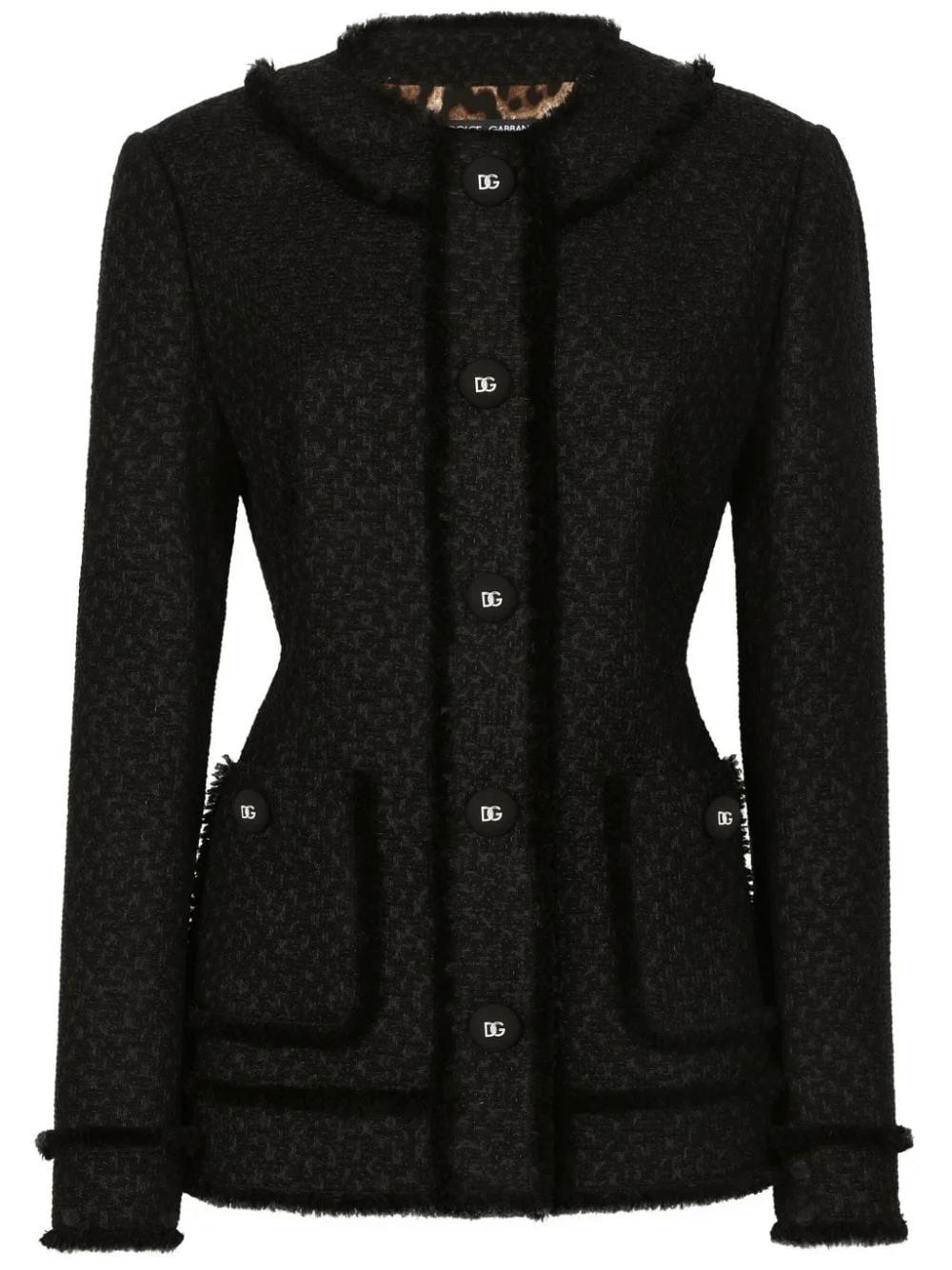 DNA logo-engraved buttoned jacket Highlights - Black - Textured finish - Button fastening - Logo-engraved buttons - Two side patch pockets - Frayed detailing - Long sleeves Made in Italy Composition Outer: Virgin Wool 67%, Viscose 27%, Polyamide 6%