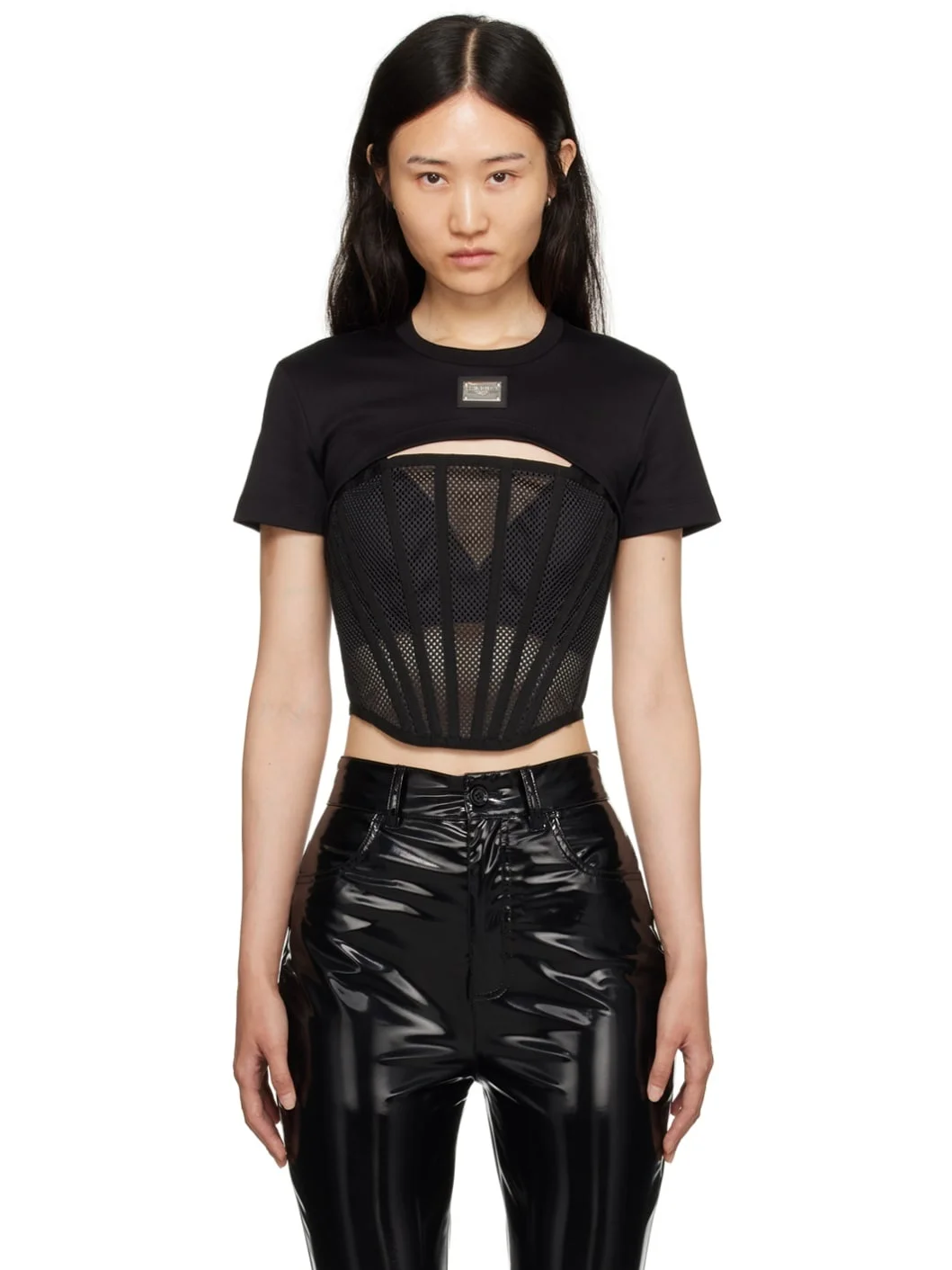 Cotton- and polyester-blend jersey and mesh T-shirt. Boning throughout. · Paneled construction · Rib knit crewneck · Logo plaque and cutout at front · Zip closures at back Supplier color: Nero Body: 50% cotton, 50% polyester. Trim: 100% cotton. Made in Italy 232003F110004