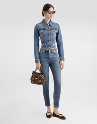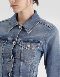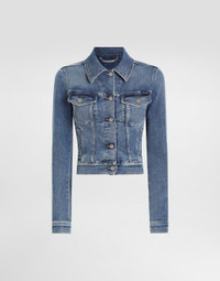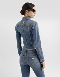 Cropped cotton denim jacket: • Blue • Shirt collar • Slim fit • Long sleeves • Branded metal and leather tag on the center back • Metal button fastenings • The piece measures 49 cm from the center back on a size IT 40 • The model is 175 cm tall and wears a size IT 40 • Made in Italy External composition: 98% Cotton 2% Spandex