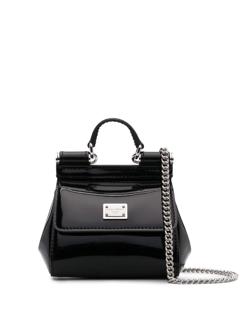 logo-plaque leather mini bag Highlights - Black - Calf leather - Patent finish - Logo plaque - Internal logo patch - Foldover top with press-stud fastening - Single top handle - Chain-link shoulder strap - Main compartment Made in Italy Composition Outer: Patent Calf Leather 100% SIZE & FIT Model measurements Height 5 ft 11 in(1.8 m) Bust/Chest 32.67 in(83 cm) Hips 36.22 in(92 cm) Waist 24.4 in(62 cm) Measurement DEPTH 2.36 in(6 cm) HANDLE 1.57 in(4 cm) HEIGHT 3.93 in(10 cm) STRAP 24.01 in(61 cm) WIDTH 5.51 in(14 cm)