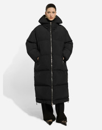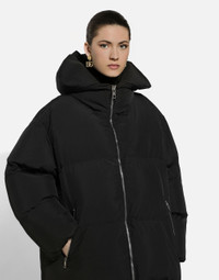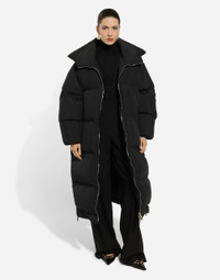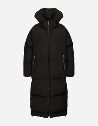 Inspired by 80s fashion photography, the Black Sicily collection masterfully blends masculine and feminine elements, pairing tailored cuts and corset details for the FW 24/25 season. A new vision of the iconic Nero Sicilia black is conveyed through contemporary and sensual looks: jackets and skirts in all-over glen plaid pair with openwork socks, while the 50s-inspired Mun shoes with Eva heel go with the houndstooth Sicily bag featuring crocodile-print leather inserts. Long padded down jacket with branded tag: • High neck • Long sleeves with stretch cuffs • Zipped pockets • Loose fit • Recycled goose down padding • Lined • Zipper fastening and branded slider • The piece measures 114 cm from the rear collar seam on a size IT 40 • The model is 175 cm tall and wears a size IT 40 • Made in Italy External composition: 100% Polyester Internal composition: 100% Polyester