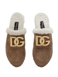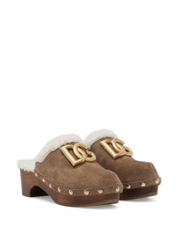 logo-plaque suede clogs Crafted from suede in Italy, these clogs from Dolce & Gabbana have a luxurious but comfortable aesthetic, setting atop a wooden sole. The pair is topped with a gold-tone logo plaque and hardware and lined with contrasting faux fur. Highlights - Light brown - Calf suede - Faux-fur lining - Gold-tone logo plaque - Gold-tone stud embellishment - Branded footbed - Round toe - Slip-on style - Stacked wooden sole Made in Italy Composition Suede 100%