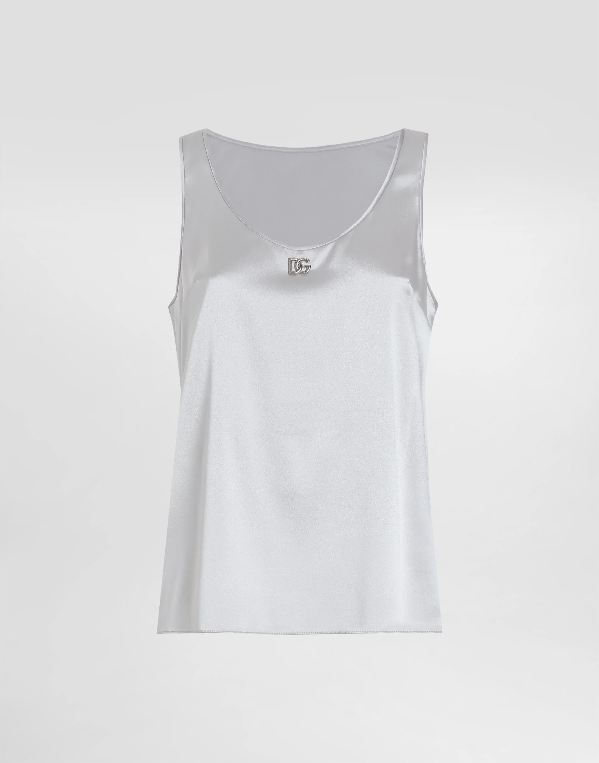The Everyday Women's Collection reimagines contemporary daily wear with Dolce&Gabbana's signature style codes. Iconic fabrics mix with standout details like embroidered flowers, crystals, and jewel buttons, infusing elegance into every look. Gray animal print accented with green and purple, hyper-geometric jewelry, voluminous shapes and transparencies add unique touches. Men's tweed is reinvented with graphic twists, creating distinctive pieces that reflect refined sensuality. Silk satin tank top with the metal DG logo pin: • Gray • Round neckline • Sleeveless • Regular fit • The piece measures 57.5 cm from the center back on a size IT 40 • The model is 175 cm tall and wears a size IT 40 • Made in Italy External composition: 93% Silk 07% Spandex