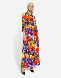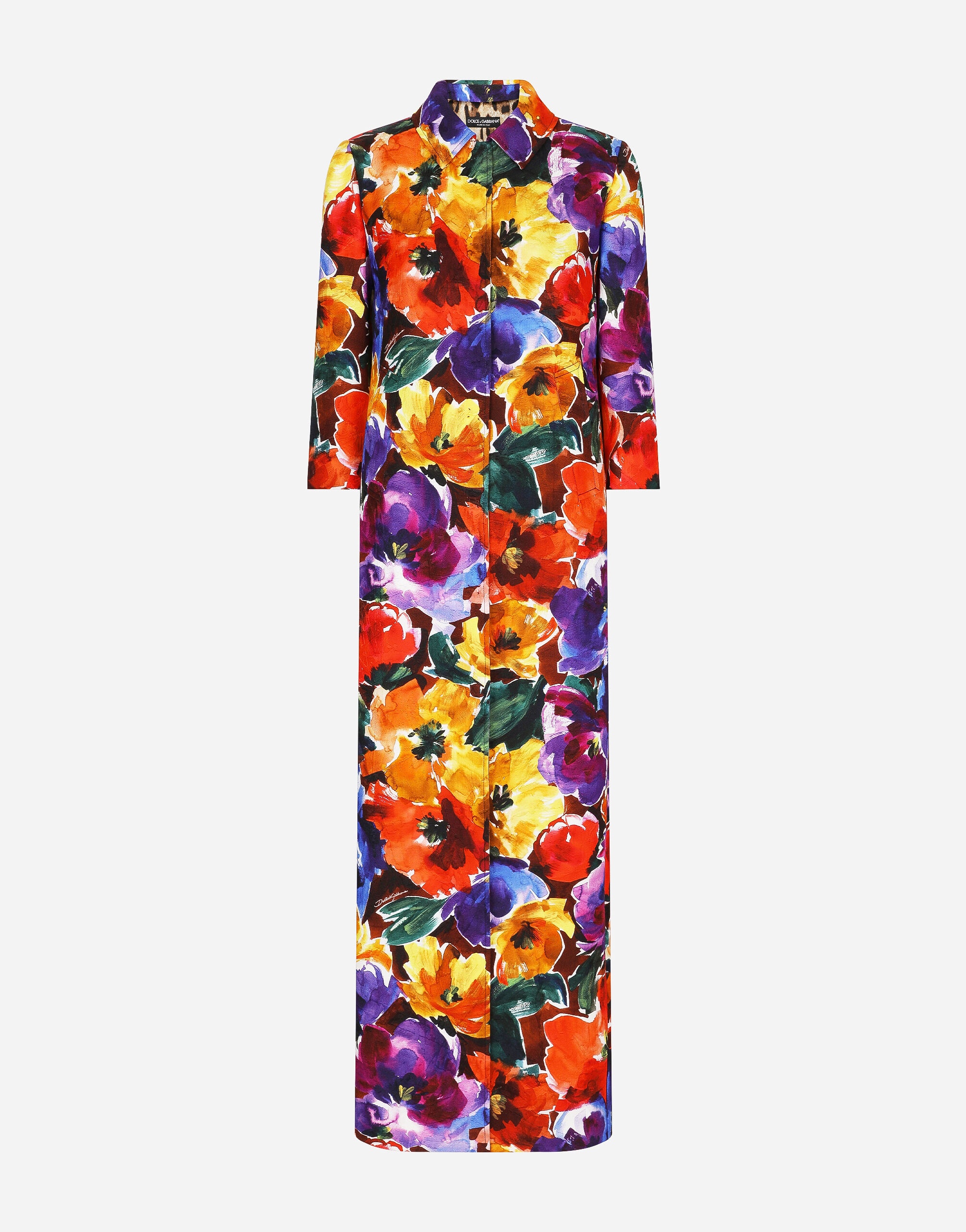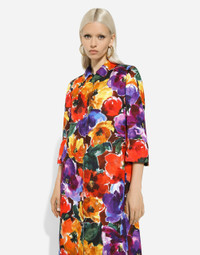 The spirit of the 1960s is taking over the new Flower Power collection. The focus is a head-to-toe floral look built around pairing and layering rose, anemone and floral bouquet maxi-prints. A cosmopolite poised between playful and sexy, this women interprets the austerity and elegance of the 1960s, harking back to boldly opulent imagery that here at Dolce&Gabbana is condensed and reinterpreted through silhouettes, ample proportions and airy shapes, bringing femininity and sensuality to the forefront. Long brocade coat with abstract flower print: • Multi-colored • Baby collar • 3/4 sleeves • Leopard-print stretch satin lining • Press-stud buttons at front • The piece measures 140 cm from the center back on a size IT 40 • The model is 175 cm tall and wears a size IT 40 • Made in Italy The difference in the print placement that you may find on this product is a feature of Dolce&Gabbana’s “Handmade” pieces. A detail that makes every garment or accessory unique and exclusive. External composition: 54% Viscose 46% Cotton Internal composition: 97% Polyester 3% Spandex