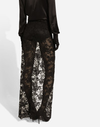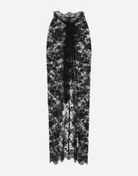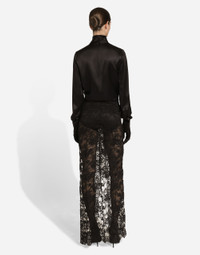 Menswear and womenswear mix and mingle, influencing one another and creating tailoring that embraces endless nuances, from the boldest to the most sophisticated, to define the rules of eternally classy femininity. A monochrome retelling in Nero Sicilia black, embellished by golden touches and rhinestones, adorning clean lines and incorporating stylish fabrics such as velvet, chiffon, lace, organza, and unique mesh details, the expression of authentic beauty for dresses, shirts and accessories. Long cotton Chantilly lace skirt: • Black • Adjustable tie waistband • Unlined • Front tie fastening • The piece measures 115 cm from the waist down on a size IT 40 • The model is 175 cm tall and wears a size IT 40 • Made in Italy External composition: 64% Cotton 36% Polyamide