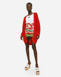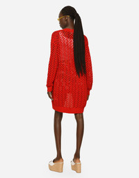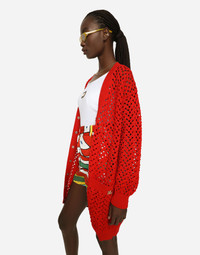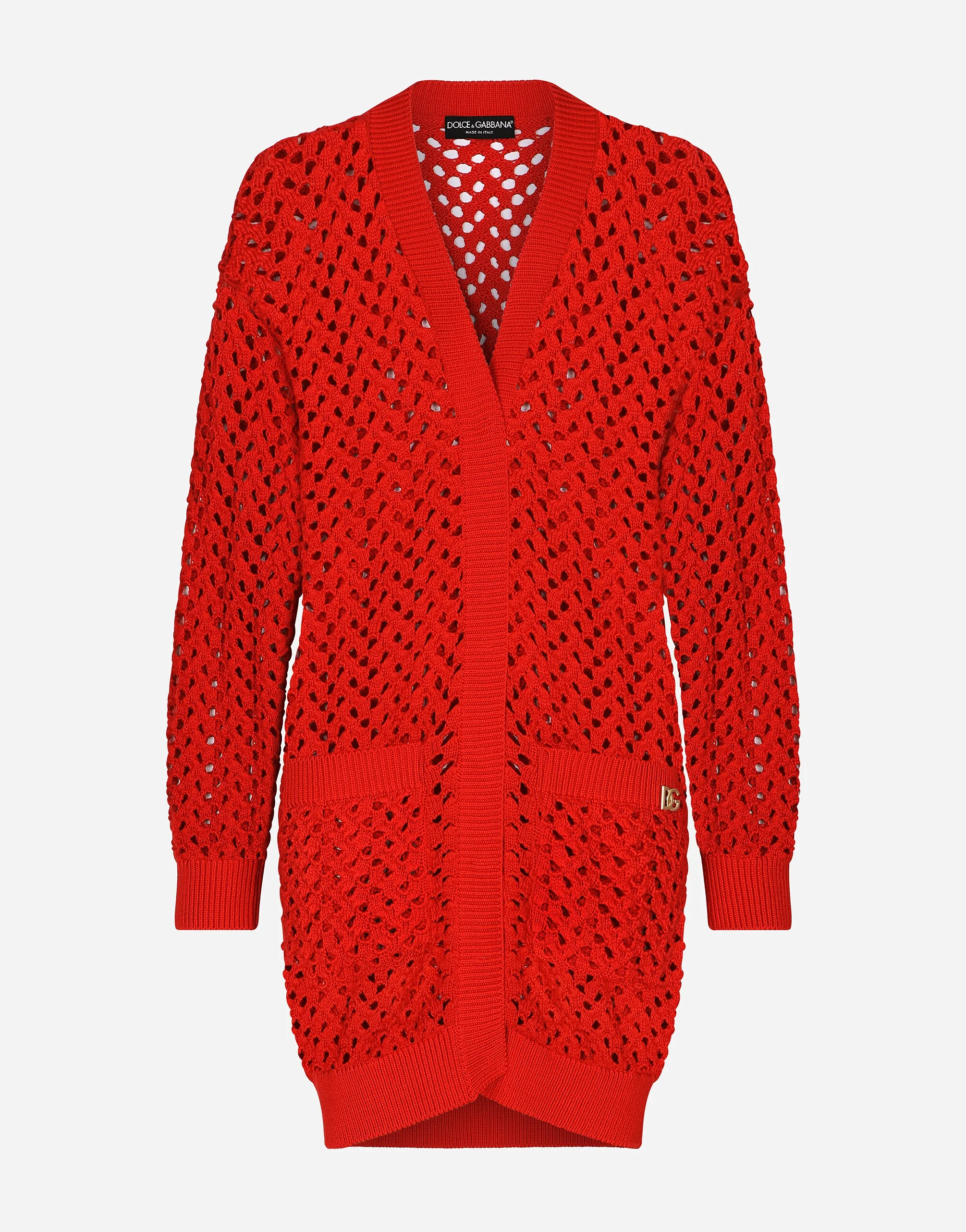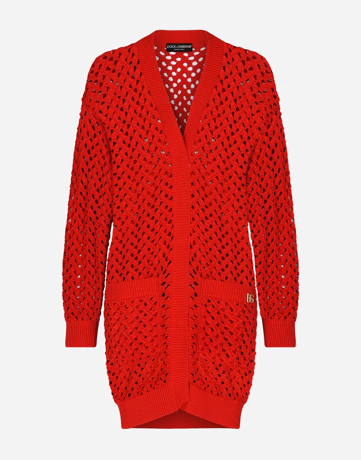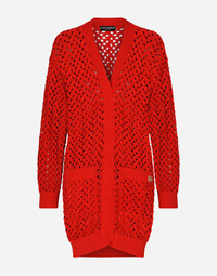 Long, oversized mesh-stitched crochet cardigan: • Red • 5-gauge knit • V-neck • Long sleeves • Oversize fit • Fine-rib trims • Press-stud fastenings • The piece measures 85 cm from the shoulder seam on a size IT 40 • The model is 175 cm tall and wears a size IT 40 • Made in Italy Care And Details External composition: 100% Cotton