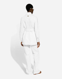 The Italian summers of the 1960s, the candid purity of white, the sophisticated elegance of the jet set of that era. The imagery of the FW24/25 Capri Collection encapsulates all this flawlessly. The pieces range from floaty poplin silhouettes or sack-style dresses and skirts, to brocade outerwear and floral-inlay fabric shirts. The iconic bags – the Logo Bag, the Sicily Bag and the Dolce Box – complement the looks, while the shoes come embroidered with designs inspired by the crystal-clear sea of Capri. Long denim jacket with belt: • White • Shirt collar • Long sleeves • Unlined • Button fastenings and belt • The piece measures 77 cm from the center back on a size IT 40 • The model is 175 cm tall and wears a size IT 40 • Made in Italy External composition: 100% Cotton