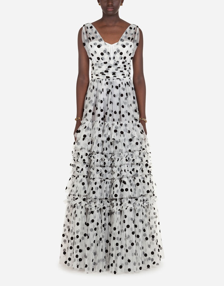 Long dress in flocked polka-dot print tulle