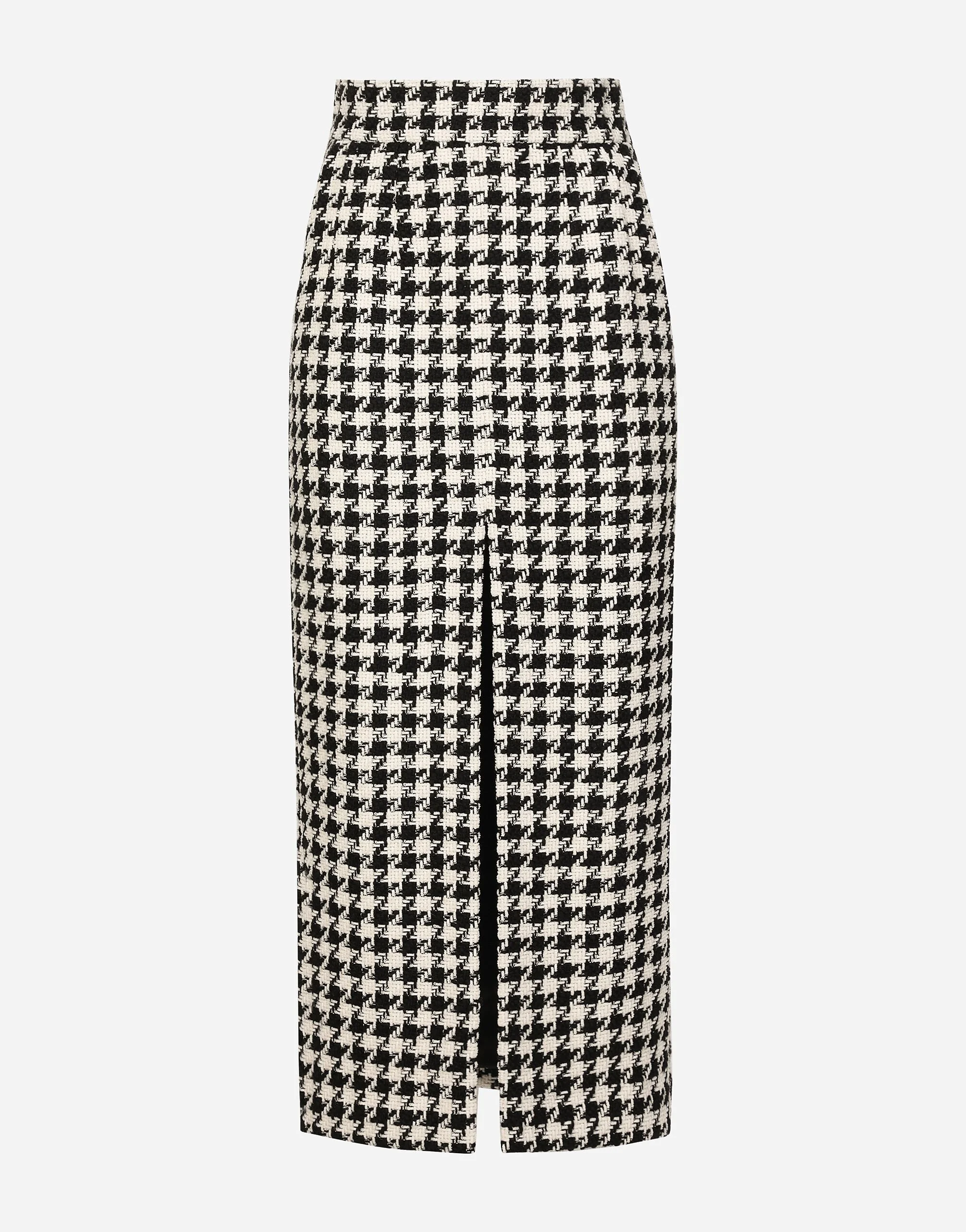 Inspired by 80s fashion photography, the Black Sicily collection masterfully blends masculine and feminine elements, pairing tailored cuts and corset details for the FW 24/25 season. A new vision of the iconic Nero Sicilia black is conveyed through contemporary and sensual looks: jackets and skirts in all-over glen plaid pair with openwork socks, while the 50s-inspired Mun shoes with Eva heel go with the houndstooth Sicily bag featuring crocodile-print leather inserts. Long wool and cotton macro-houndstooth skirt: • White and Black • High-waisted • Central front slit • Stretch silk satin lining • Rear zipper and hook-and-eye fastening • The piece measures 90 cm from the waist down on a size IT 40 • The model is 175 cm tall and wears a size IT 40 • Made in Italy External composition: 65% Virgin Wool 35% Cotton Internal composition: 92% Silk 8% Spandex